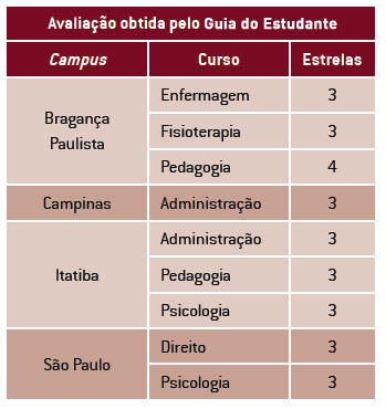 A USF, mais uma vez, conquistou estrelas no Guia do Estudante, da Editora Abril. Considerado uma das mais importantes publicações do segmento de ensino superior no país, ele avalia, com pontuação até cinco estrelas, os cursos superiores com titulação de bacharelado e com turma formada há, pelo menos, um ano. A partir de um questionário, a publicação avalia a formação do corpo docente, projetos e pesquisas desenvolvidas, além da infraestrutura que cada curso oferece aos alunos.