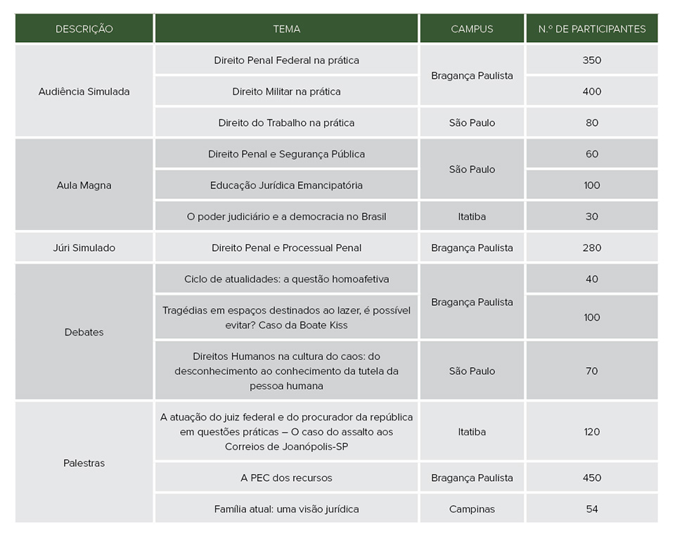 Periodicamente, a Universidade São Francisco realiza eventos na área de Direitos Humanos e Justiça para que, na prática, seus alunos possam aprender mais sobre situações corriqueiras no exercício da sua futura profissão.