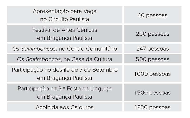 Grupo de Teatro Reserva CulturalCriado por meio do curso livre de teatro da USF, o grupo reúne 17 alunos da instituição no campus Bragança Paulista. Os integrantes realizam apresentações de peças voltadas para a manifestação da arte na comunidade, bem como em espaços públicos.